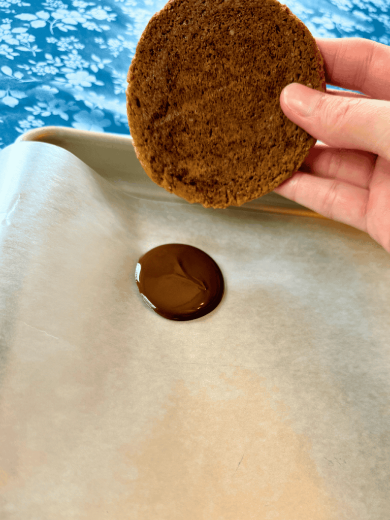 - Use a large spoon to add about a tablespoon of melted chocolate (about half the size of the cookie) onto the wax paper and then gently press the cookie onto the chocolate. Once the baking tray is full, move it to the fridge or freezer for at least 20-30 minutes to set the chocolate.
