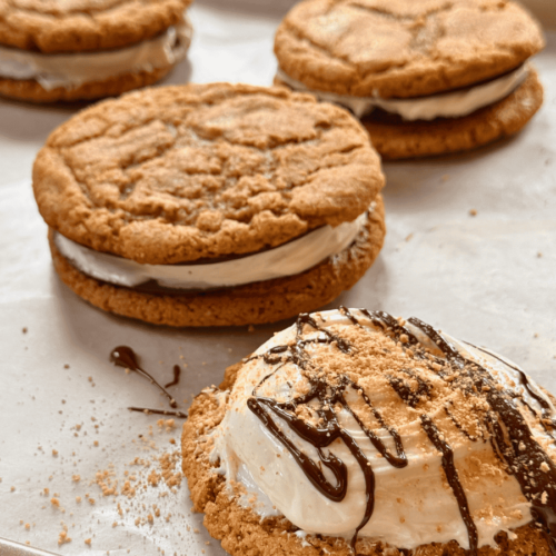With a buttery graham cookie base, a layer of smooth melted chocolate, and a swirl of homemade marshmallow frosting, these s’mores cookies are a representation of everything you love about the original. Whether you serve them open-faced with a light chocolate drizzle or sandwich them together for less mess, they’re perfect for cookouts, parties, or just a fun afternoon treat. (I made them for a 4th of July cookout, and people RAVED about them!)